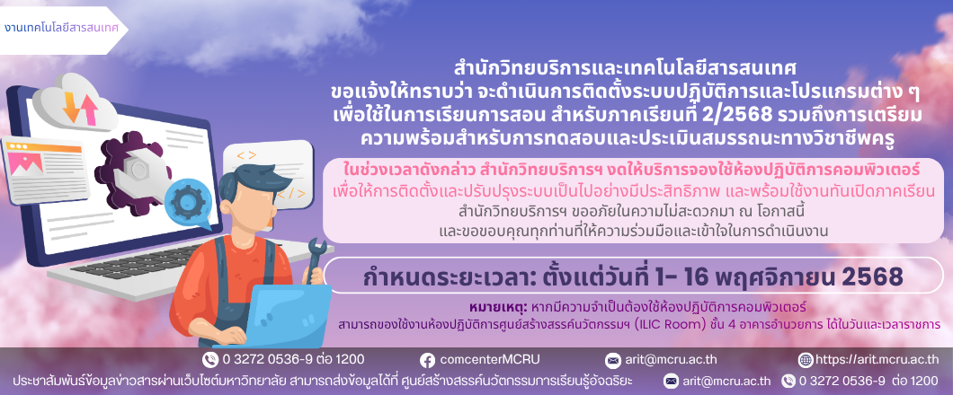 งานเทคโนโลยีสารสนเทศ สำนักวิทยบริการและเทคโนโลยีสารสนเทศ ขอแจ้งให้ทราบว่า จะดำเนินการติดตั้งระบบปฏิบัติการและโปรแกรมต่าง ๆ เพื่อใช้ในการเรียนการสอน สำหรับภาคเรียนที่ 2/2568 รวมถึงการเตรียมความพร้อมสำหรับการทดสอบและประเมินสมรรถนะทางวิชาชีพครู