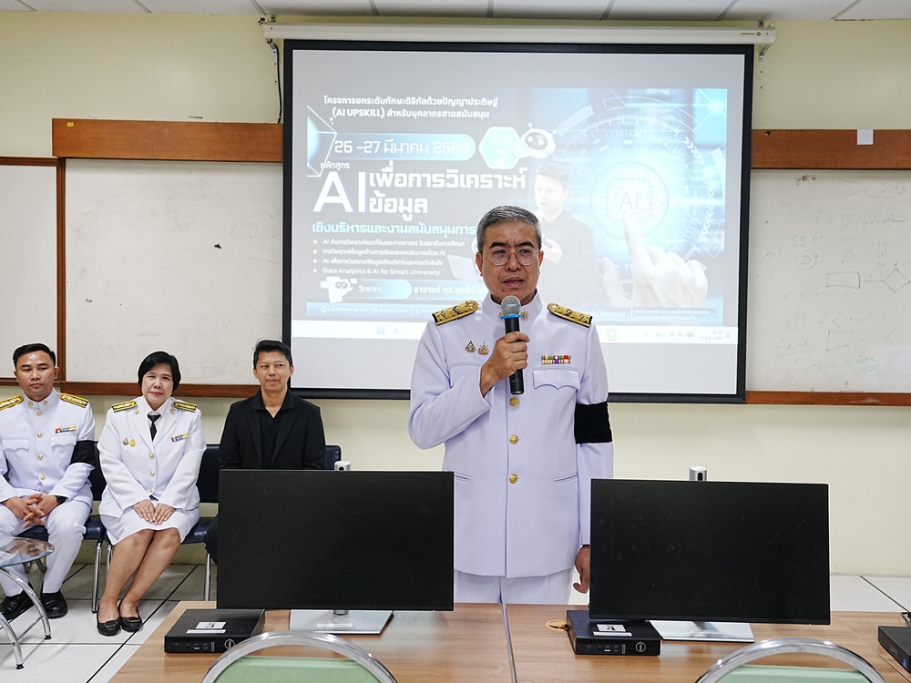 การอบรมดังกล่าวจัดขึ้นระหว่างวันที่ 26 – 27 มีนาคม 2569 โดยมุ่งเน้นการเสริมสร้างความรู้ ความเข้าใจ และทักษะการใช้เครื่องมือ AI ในการจัดการ วิเคราะห์ และนำเสนอข้อมูลเชิงบริหาร ให้แก่บุคลากรสายสนับสนุน เพื่อเพิ่มขีดความสามารถในการปฏิบัติงานและรองรับการเปลี่ยนแปลงของเทคโนโลยีดิจิทัลในยุคปัจจุบัน