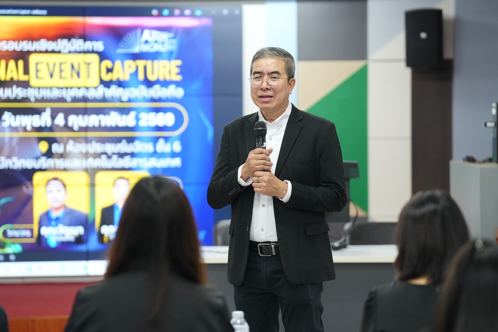 วันที่ 4 กุมภาพันธ์ 2569 ผู้ช่วยศาสตราจารย์ ดร.อดิศักดิ์ แสงส่องฟ้า ผู้อำนวยการสำนักวิทยบริการและเทคโนโลยีสารสนเทศ มหาวิทยาลัยราชภัฏหมู่บ้านจอมบึง ให้เกียรติเป็นประธานในพิธีเปิดโครงการอบรมเชิงปฏิบัติการ “PROFESSIONAL EVENT CAPTURE: เทคนิคบันทึกภาพงานประชุมและบุคคลสำคัญฉบับมือถือ”